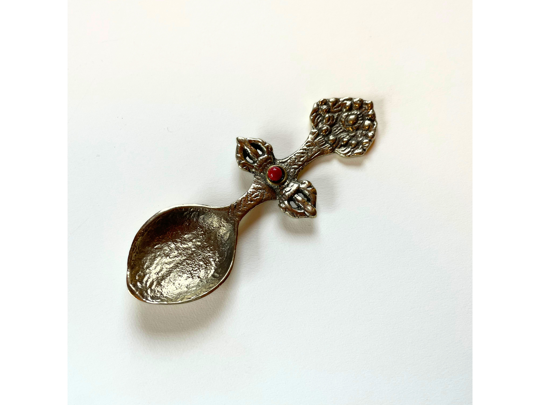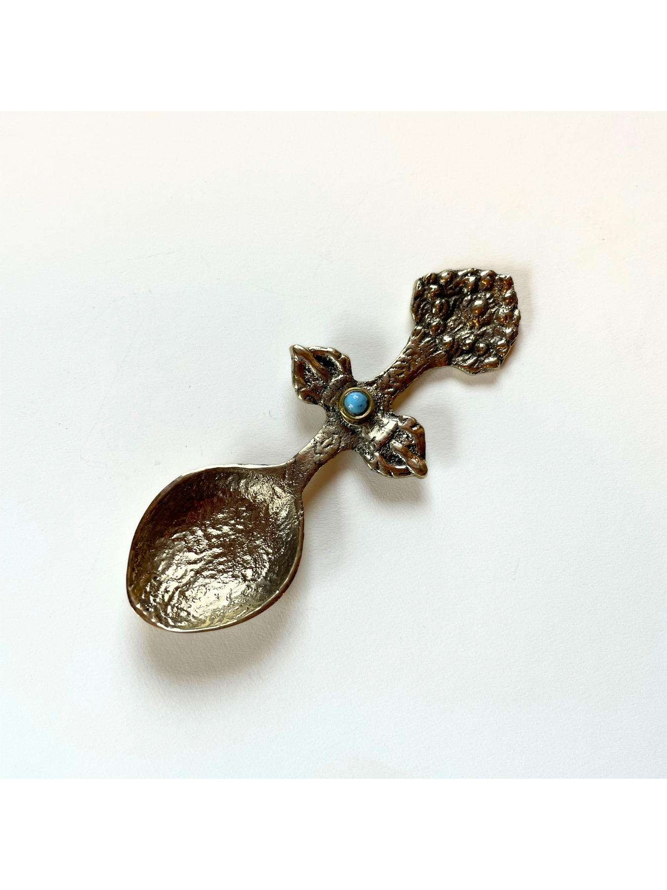 One ritual spoon, brass with inset stone, turquoise or coral.