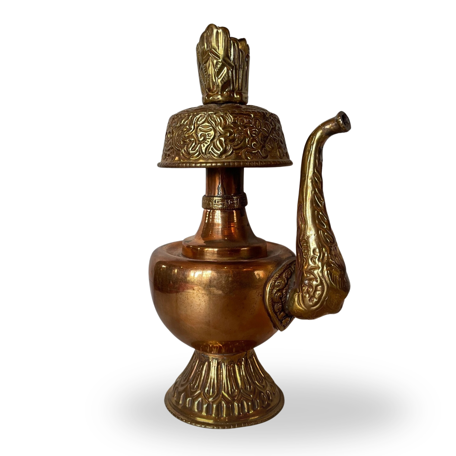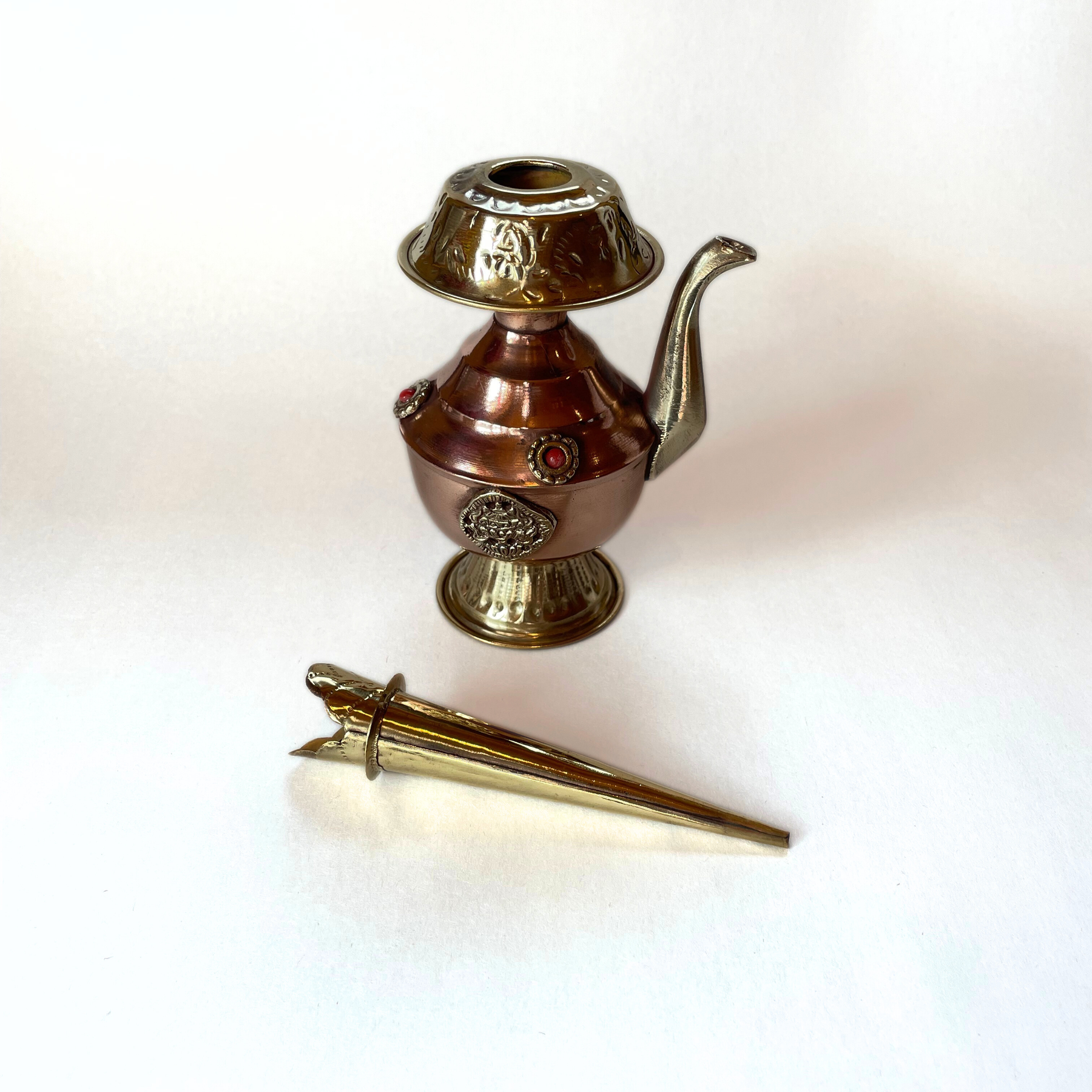 This bumpa is made of copper with brass details, and coral accents. A bumpa fan holder made of brass is included.